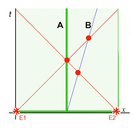 Supposons un train très long se déplaçant à vitesse constante relativement à la voie. Deux signaux qui sont simultanés par rapport à la voie sont-ils également simultanés par rapport au train ? La réponse est négative. Les signaux émis à chaque bout d’un quai (x) étant reçus simultanément par un observateur (A) placé au milieu de celui-ci, qu’en sera-t-il pour un observateur (B) placé à bord du train ? Même si les observateurs du quai et du train sont à égale distance de chaque bout du quai au moment de l’émission des signaux, l’observateur du quai les recevra simultanément alors que celui du train les recevra successivement, car il se dirige vers le lieu d’émission du signal E2 et s’éloigne de celui du signal E1.