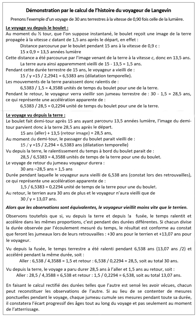 Le voyage a duré 200 ans pour les terriens et seulement 2 ans pour le voyageur. Si le temps du voyageur s’est écoulé comme sur terre pendant la phase inertielle, la durée de celle-ci ne peut être supérieure au temps vécu par lui, c’est à dire 2 ans, ce qui suppose que le temps a été complètement suspendu pendant les accélérations et décélérations ayant durées 198 ans. Si tel était le cas, nous le saurions, il faut donc en conclure que le ralentissement temporel est progressif, ce qui ampute d’autant le temps de trajet inertiel. Les périodes d’accélération et de décélération ont donc duré entre 198 ans et 200 ans… et Langevin n’en parle pas ! C’est ridicule. Sauf à conclure que les calculs sont faux, ce que personne ne prétend, cette explication ne tient pas une seconde.