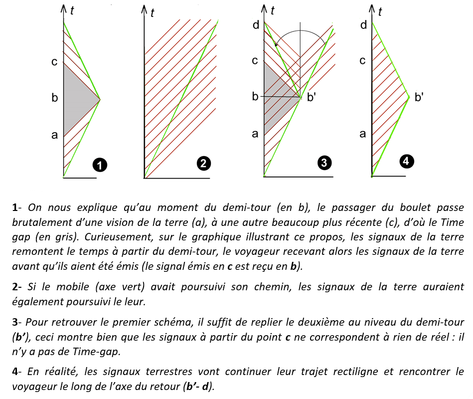 Le changement de référentiel n’a pas pour effet d’avaler le temps du voyageur, mais simplement de changer les conditions d’observation. Il y a bien, en effet, rupture de symétrie, en ce sens que la réciprocité des observations suppose un mouvement relatif continu. La symétrie n’est qu’apparente et ne dure qu’autant que dure le mouvement continu. Il y a bien deux référentiels distincts en cas d’aller-retour, car, à cause de l’effet Doppler, chacun observe un ralentissement du temps chez l’autre à l’aller et une accélération au retour. Par ailleurs, en tenant compte, non pas d’observations ponctuelles, mais de la durée totale du voyage, il apparaît que le trajet du boulet de Langevin est réparti en deux parties de durée égale pour le voyageur, ce qui est normal pour un aller-retour, mais que vu depuis la terre, l’aller dure deux siècles et le retour seulement deux jours. Ces anomalies permettent de distinguer qui se déplace réellement, ce qui n’aurait pas été le cas si le mobile avait continué à s’éloigner indéfiniment. Ceci démontre bien que la symétrie constatée entre deux référentiels inertiels n’est qu’un effet d’observation, une illusion fugace.