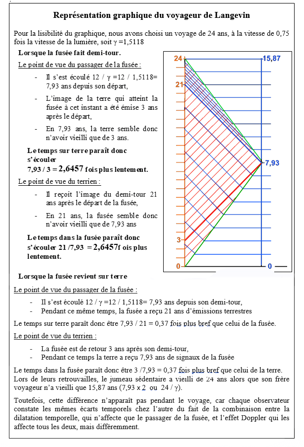 La relativité du mouvement est un bien mauvais candidat pour expliquer la symétrie décrite dans l’histoire du voyageur en boulet. Paul Langevin tient compte de l’effet Doppler dans ses calculs. Bien sûr, l’effet Doppler est dissymétrique, alors que les observations réciproques des terriens et du voyageur sont symétriques, mais il faut également tenir compte de l’inflation temporel qui affecte le seul voyageur. Pour vérifier que le cumul de l’effet Doppler et de la dilatation temporelle aboutit à la symétrie des observations, il suffit de faire le calcul.