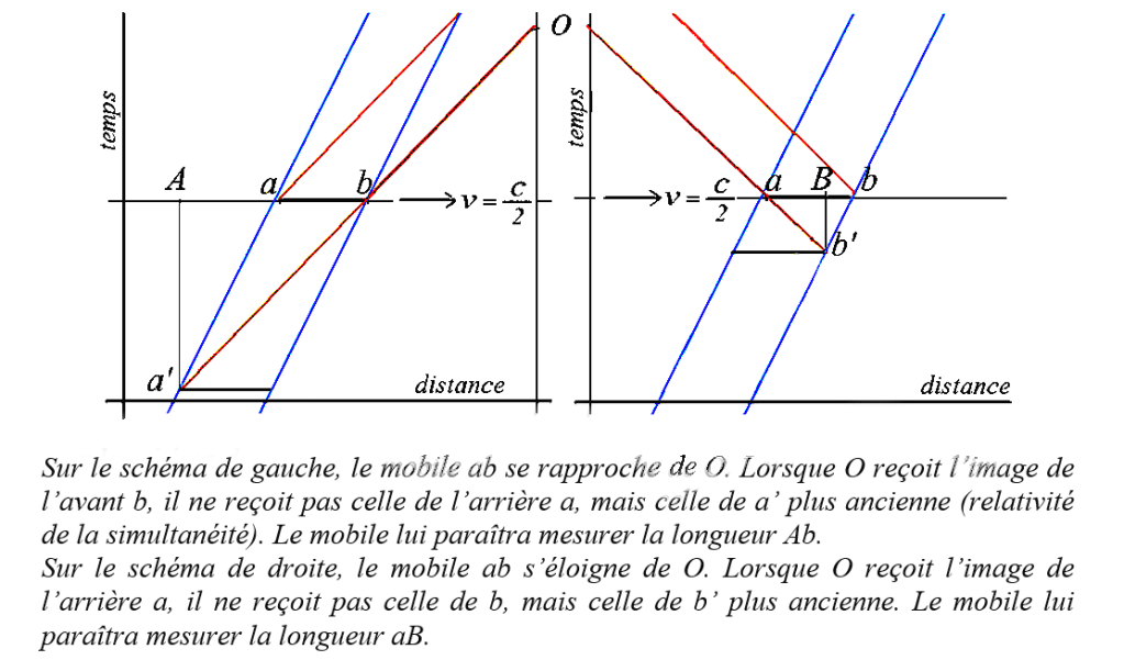 Supposons un objet mobile et très long qui s’approche de l’observateur, passe à proximité puis s’éloigne. Pendant la phase d’approche, l’image de l’extrémité la plus éloignée (l’arrière) met un temps plus long pour parvenir à l’observateur que celle plus proche (l’avant), l’image de l’arrière est donc plus ancienne et correspond à une position plus éloignée dans le temps et dans l’espace que celle de l’avant : l’objet mobile paraîtra plus long qu’il n’est en réalité. Pendant la phase d’éloignement, l’image de l’extrémité la plus éloignée (l’avant) mettra plus de temps à parvenir à l’observateur que l’extrémité la plus proche (l’arrière), l’image de l’avant est plus éloignée dans le temps et donc plus proche dans l’espace : l’objet mobile paraîtra plus court qu’il n’est en réalité. Lorsque le mobile est au plus près de l’observateur, les deux extrémités sont à égale distance et l’objet apparaît à sa longueur réelle. Ce n’est évidemment pas ce qui est attendu, car la contraction relativiste ne dépend pas de la position de l’objet par rapport à l’observateur, mais uniquement de sa vitesse.